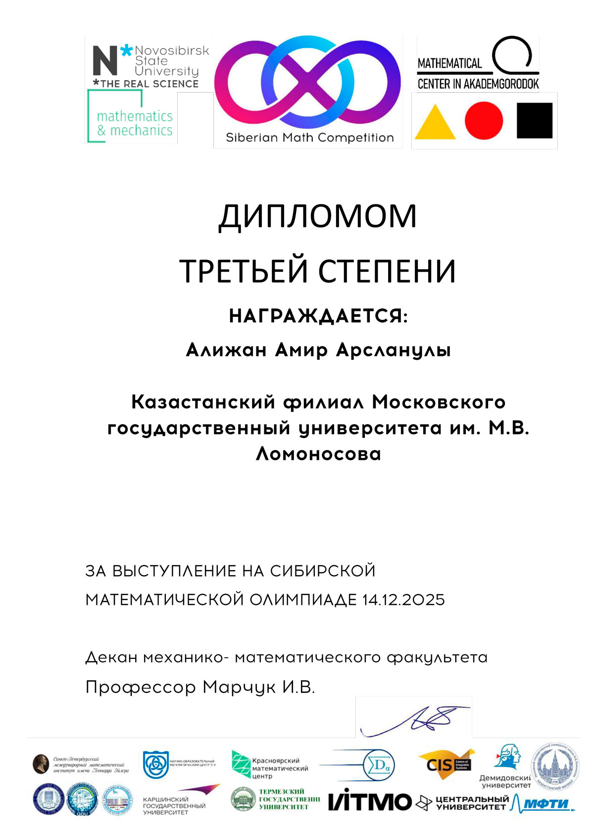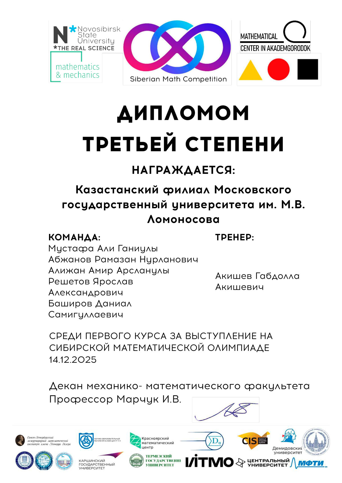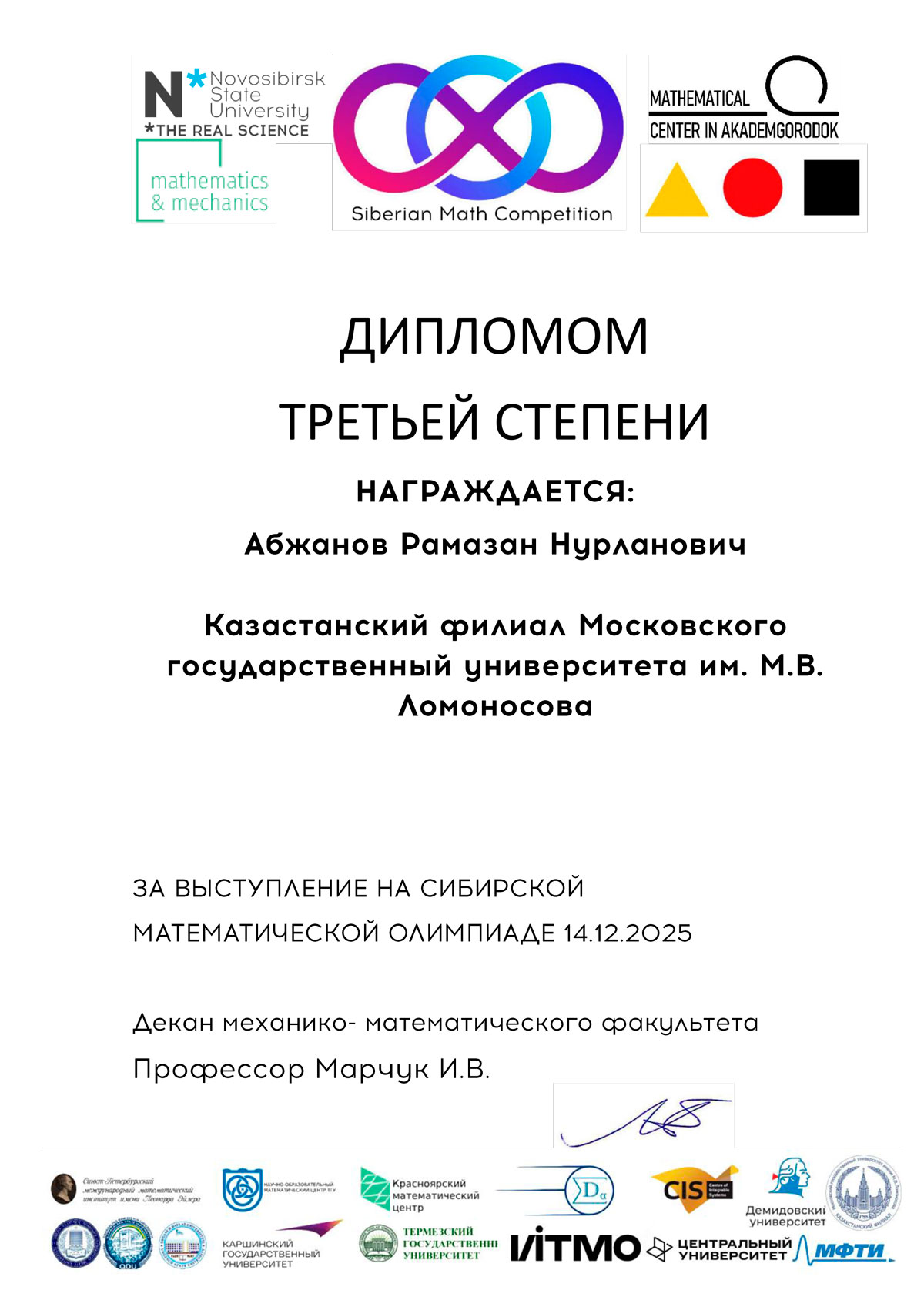 14 декабря 2025 года Казахстанский филиал МГУ имени М.В. Ломоносова при поддержке Представительства Россотрудничества в Республике Казахстан выступил площадкой проведения Сибирской математической олимпиады. Основным организатором олимпиады является механико-математический факультет Новосибирского государственного университета (Новосибирск, Россия).
