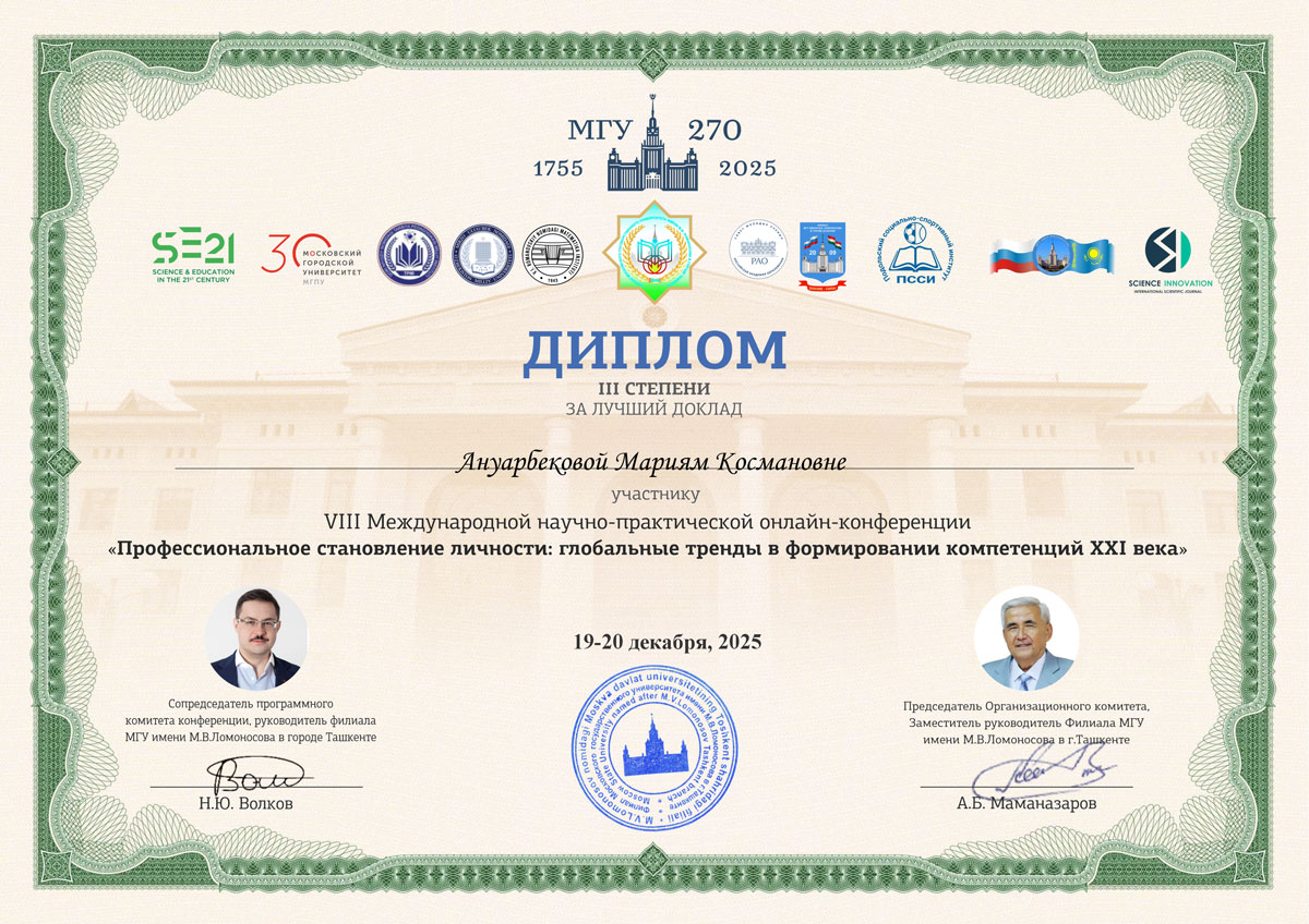 19–20 декабря 2025 года состоялась VIII Международная научно-практическая онлайн-конференция «Профессиональное становление личности: глобальные тренды в формировании компетенций XXI века», проведённая на базе Ташкентского филиала МГУ имени М. В. Ломоносова.